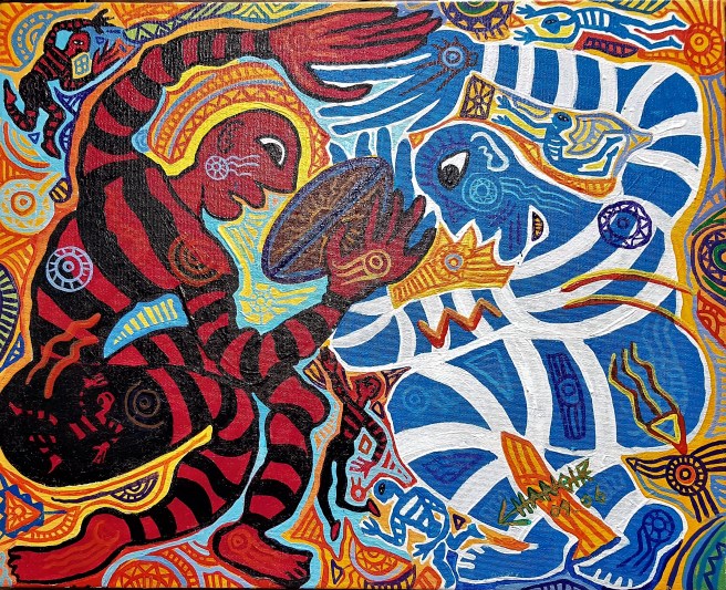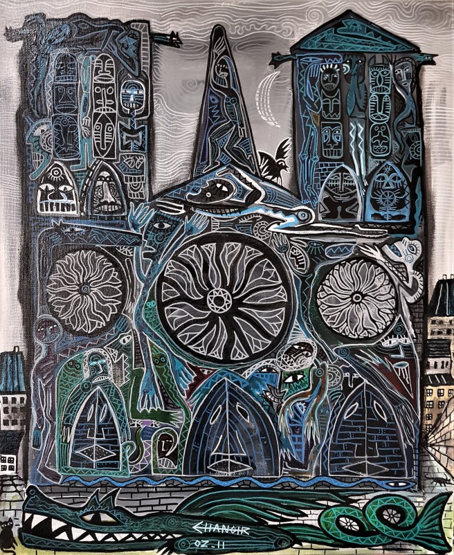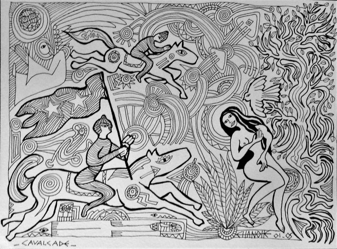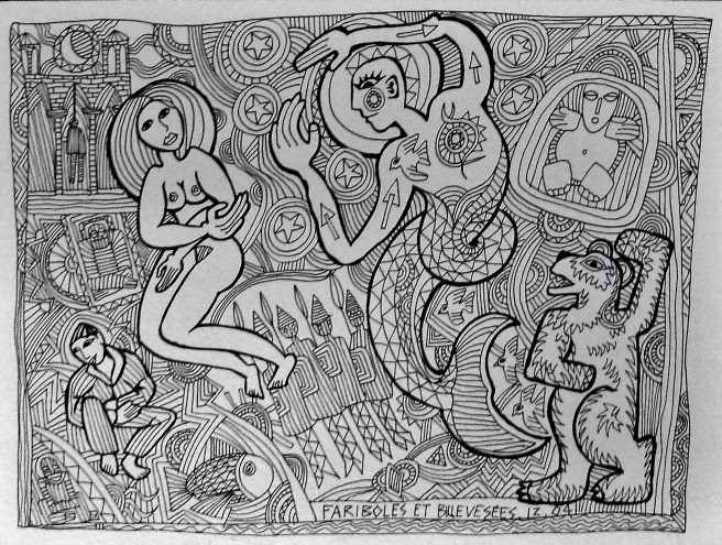 « Tikis et lézard », acrylique sur toile, 73 x 91 cm, 01-09 « Notre Dame des Angoisses », acrylique sur toile, 60 x 50 cm, 02-11« Allez le stade, con ! », acrylique sur toile, 35 x 41 cm, 09-06« Silence », encre et feutre sur papier 300 gr, 23 x 31 cm, 03-05« Les danseuses », huile sur toile, 40 x 30 cm, 08-09« Fariboles et billevesées », encre sur papier 300 gr, 23 x 31 cm, 12-04« Cavalcade », encre sur papier 300 gr, 23 x 31 cm, 01-05