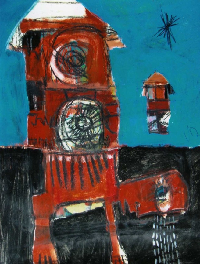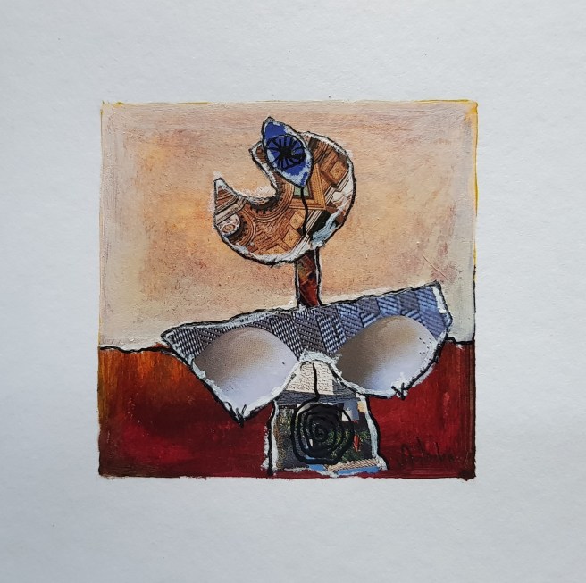 « Time to go », acrylique, crayon, pastel et encre sur papier 200 gr, 65 x 50 cm« Nomade », acrylique, crayon, pastel et encre sur papier 200 gr, 65 x 50 cm« Home, sweat home », acrylique, graphite, collage et encre de Chine sur toile, 30 x 40 cm« Les seins lourds », acrylique, collage, pastel et encre sur papier 360 gr, 17 x 17 cm