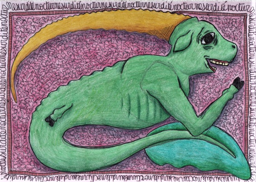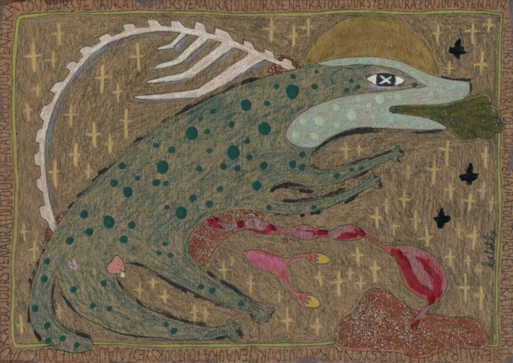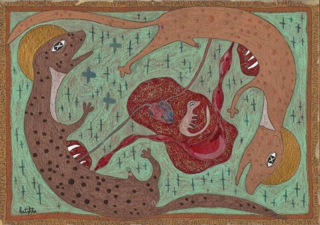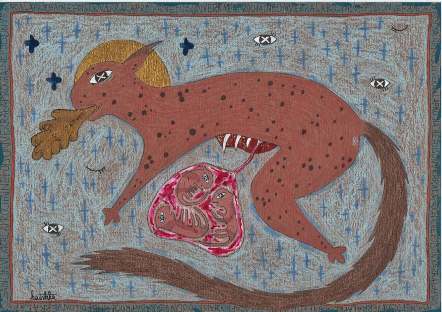 KATSHKA : « J’ai toujours dessiné. Je voulais sortir ce qu’il y avait dans ma tête et le rendre concret, réel, palpable en le couchant sur une feuille. Pourtant, chaque fois que je dessinais, je jetais mon dessin quand j’estimais qu’il était abouti. Comme si je voulais effacer mes pensées. Je faisais ça quand j’étais seule. Mais un jour, c’était en 2021, une blessure m’a immobilisée physiquement. Entourée de mes proches, ceux-ci en voyant mes dessins m’ont encouragée, à ne plus les supprimer. Je les ai donc gardés et moi-même j’ai commencé à vraiment les regarder. C’est à partir de là que les idées abstraites sont devenues des choses concrètes. Et c’est comme ça que j’ai donné vie à des animaux morts.