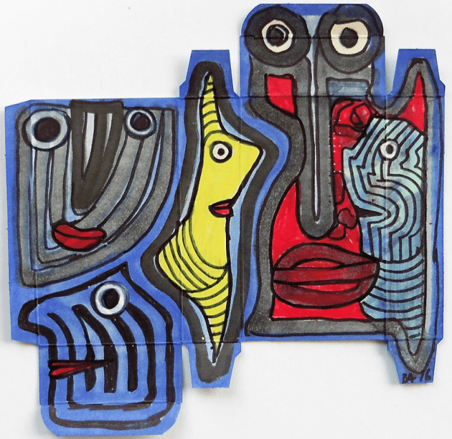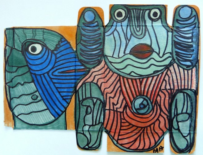 Sans titre, stylos bille et feutres sur carton d’emballage (brandade de morue), 29 x 8 cm, 2016